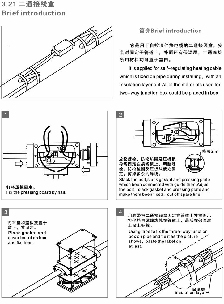 两根或多根电伴热带可使用中间接线盒连接使用,因为电伴热带之间不可直接连接。当管道或设备需要分支伴热时,可使用中间接线盒分开安装电伴热带,以增加使用长度。如果单根电伴热带中间损坏,可将中间损坏的部分剪掉,用中间接线盒连接即可使用,不会造成浪费。中间接线盒分为二通接线盒与三通接线盒,那我们通过以下的示意···