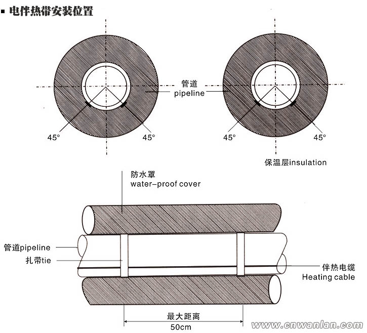 电伴热带安装是需要专业人员来操作,是否能够正确安装,直接影响电伴热带系统的正常运行和伴热保温效果。对于常用的安装需求,我们通过安装图片示意图,描述电伴热带安装的正确方式,以下的多组安装示例图适用于自限温电伴热带、恒功率电伴热带、加热电缆等相关的电伴热产品。