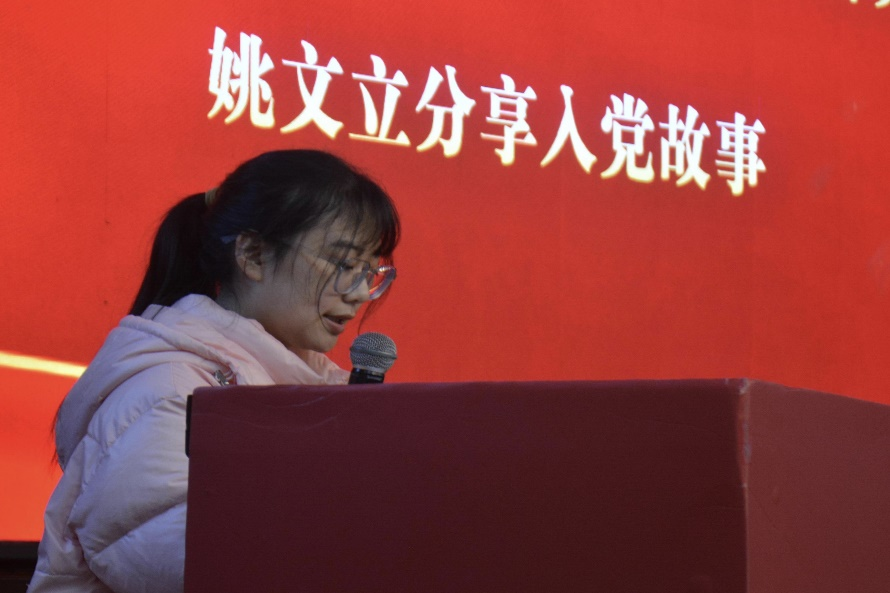 国家奖获得者、原学生党支部党建助理姚文立,作为优秀党员榜样,登台分享了她的入党故事。她以真挚的情感和生动的语言,深情讲述了自己从一名普通学生到成长为共产党员的心路历程,展现了她在党的培养下不断追求进步、勇于担当的历程,激励着更多青年学子坚定信念,积极向党组织靠拢。
