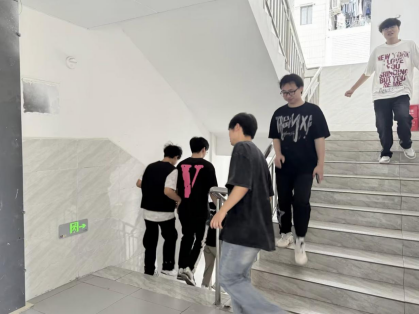 中午12点整,随着急促的警报声响起,演练正式启动。全体学生在室长以及楼长的引导下,迅速关闭电源、弯腰低姿沿指定逃生路线撤离宿舍楼。疏散过程中,各楼层负责人实时疏导,确保通道畅通无阻。仅用4分20秒的时间,全体24级学生安全抵达操场指定区域,各班级快速清点人数并上报,整个过程高效有序。