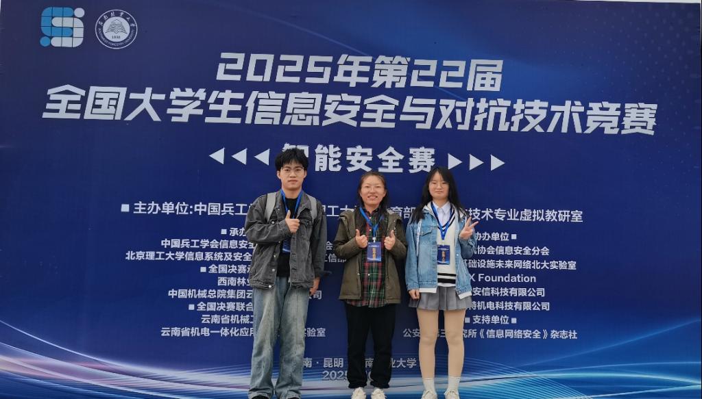 我院王崇远、陈雪怡、袁浩杰同学在参加第22届全国大学生信息安全与对抗技术竞赛(智能安全赛-区域赛-小型人形机器人)省赛中表现优异,荣获省一等奖,于10月25-26日受邀参加位于昆明、由中国兵工学会牵头举办的2025年第22届全国大学生信息安全与对抗技术竞赛全国总决赛。