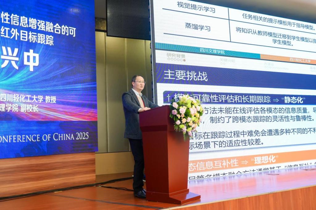 在备受关注的大会报告环节,副校长熊兴中教授作了题为《基于跨模态一致性信息增强融合的可见光与热红外目标跟踪》的特邀报告。面对复杂环境下智能感知的动态适应与长期稳定跟踪难题,系统介绍了其团队的研究进展,创新性地提出了“动态感知—冲突治理—长期记忆”的一体化技术体系。该技术通过在线评估多模态可靠性、智能抑制信息冲突、融合长效记忆机制,为实现低空技术与工程、公共安全、边境监控等场景中鲁棒、稳定的目标跟踪提供了创新解决方案。报告内容前沿、逻辑清晰,引发了与会专家的热烈讨论与高度评价。