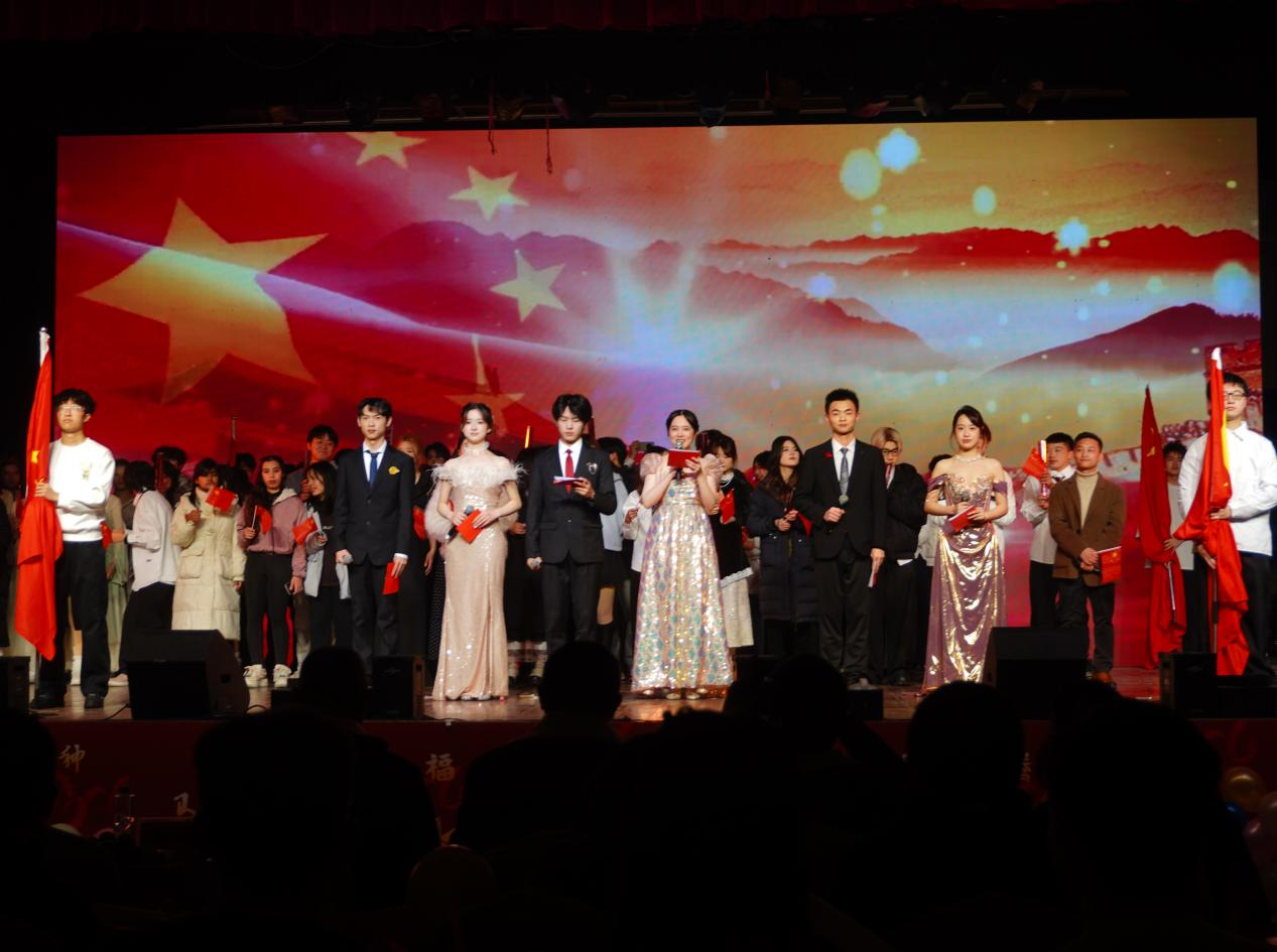 青春感悟映初心,真情流露动人心。我院学子胡可兴奋地表示:“《如愿》中‘山河无恙,烟火寻常’这句歌词深刻触动内心,令我不禁想起林则徐‘苟利国家生死以,岂因祸福避趋之’的赤诚之心。这种为国担当的无畏品格,正是我们年轻人应当传承的。”《炬火》演讲者谭凯锜难以抑制激动之情:“站在舞台上,既紧张又兴奋。那些文字不再冰冷,反倒成为内心的呼唤,让我感受到前所未有的使命感。炬火不灭,代代相传,每个字如同心跳般有力,每次停顿仿佛呼吸般自然,与先辈的精神同频共振。”随着大合唱《红旗飘飘》的激昂旋律落幕,本次迎新晚会圆满结束。