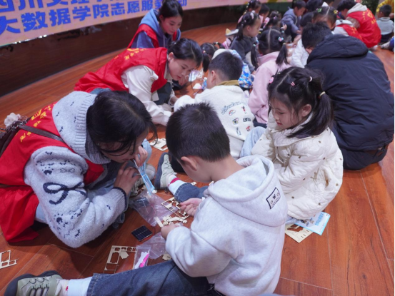 展演结束后,趣味十足的科学小手工实践课随即开启。志愿者化身“科普导师”,采用“一对一”“一对二”分组模式,带领孩子们动手拼装密码锁、小汽车、3D投影仪等模型。从零件识别到组装拼接,从原理讲解到成品展示,志愿者耐心引导、细致答疑,孩子们专注投入、互帮互助,在亲手操作中感受机械构造的精妙,在探索实践中直观理解科学原理。志愿者张甜甜在活动后深有感触地说:“科技强国的建设,既需要前沿领域的攻坚克难,也离不开在童年时光播下的科学火种。能见证孩子们眼中的光,这份志愿服务格外有意义。”