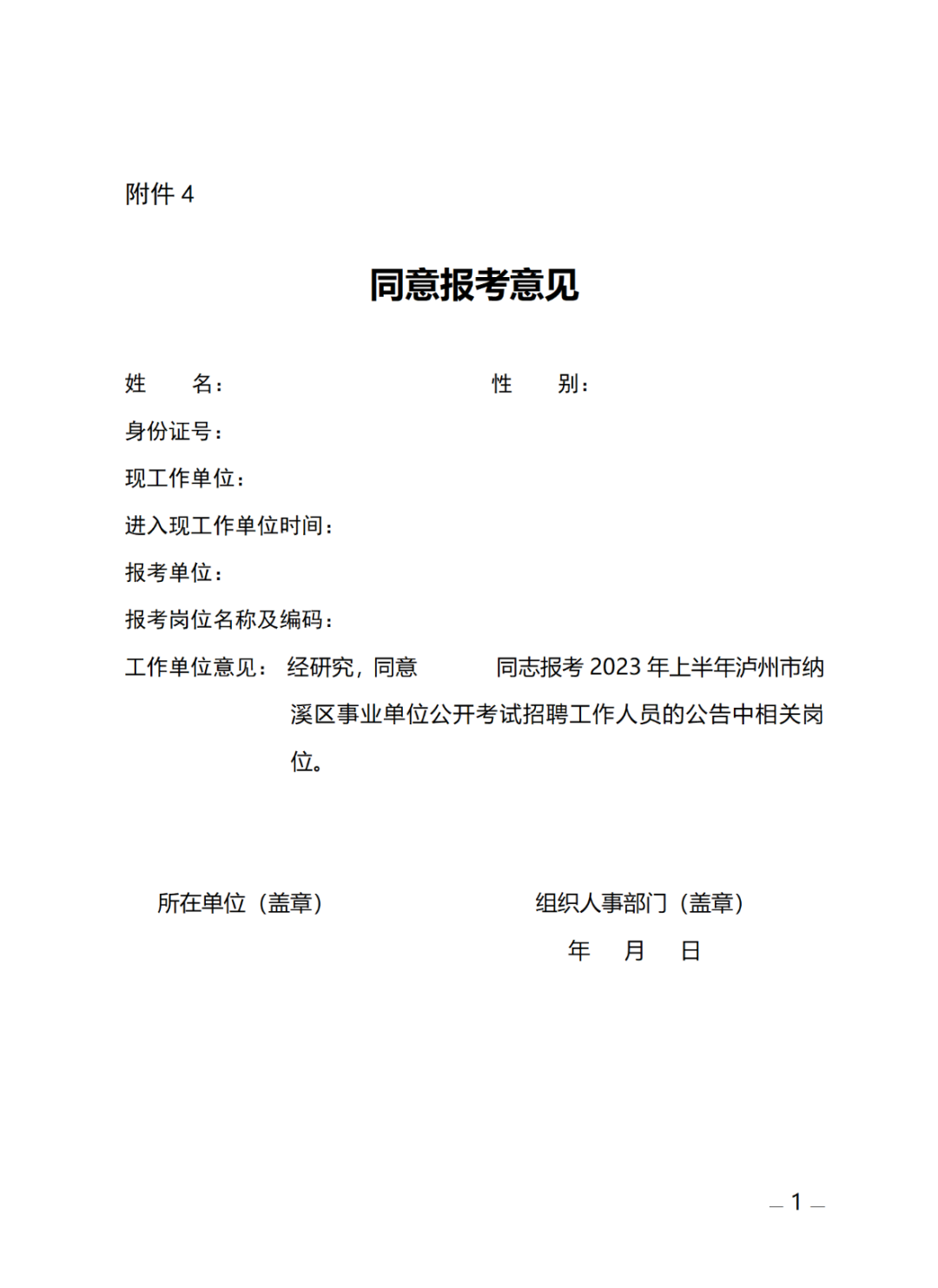 (3)考生是机关事业单位正式占编人员,须具有人事管理权限的组织人事部门(单位)出具同意报考的审查意见(附件4);委培、定向毕业生,须原委培、定向单位出具同意报考的手续,不能提供的,将不予审核通过。