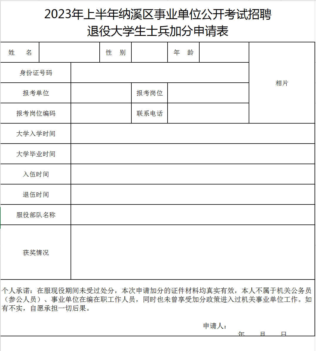(2)申请加分的退役大学生士兵,须提供本人有效的《退出现役证》、《优秀士兵(义务兵)证》、有关奖励证书(证章)和相关学历证书、身份证、报名信息表、本人亲笔签名的加分申请表(附件3)等材料。