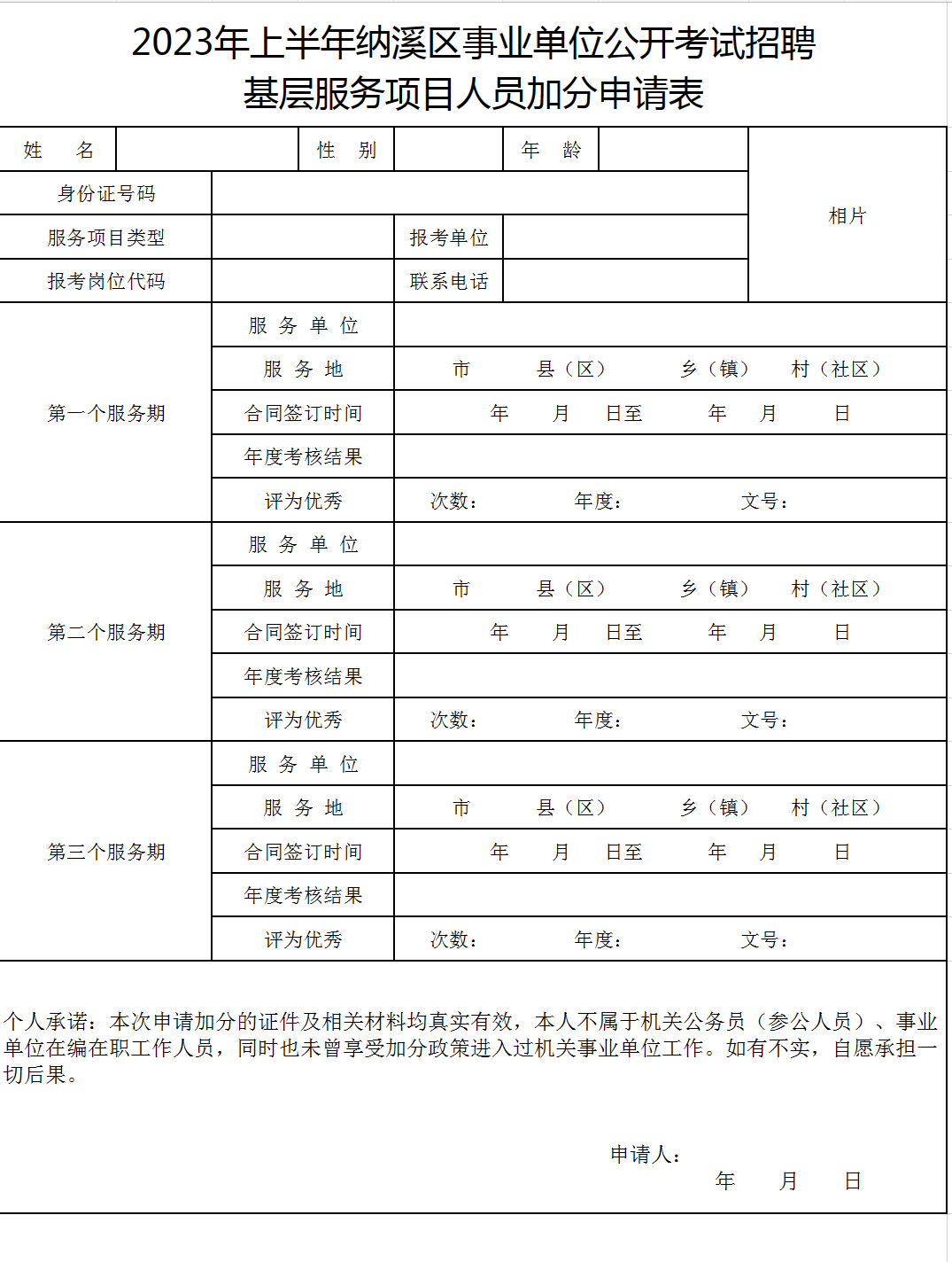 (1)“大学生志愿服务西部计划”、“三支一扶”计划以及“农村义务教育阶段学校教师特设岗位计划”和大学生村(社区)干部,须提供本人亲笔签名的加分申请表(附件2)、考核材料、服务合同(协议)和服务证书、身份证、报名信息表等材料。