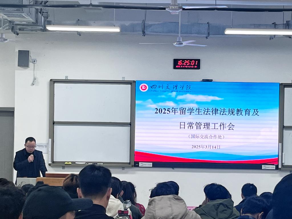 为深化留学生法治教育,提升留学生知法守法意识,保障校园安全稳定,3月14日,我校联合达州市通川区公安局出入境管理大队、达州市公安局交警直属一大队、达州市通川区公安局禁毒大队、以及达州市通川区公安局莲花湖派出所,共同举办2025年留学生法律法规及日常管理教育工作会。副校长陈光平出席并讲话,学生工作处、国际交流合作处、保卫处、文学与传播学院、财经管理学院、英国上市公司365负责人、留学生班主任及全体留学生参加,会议由国际交流合作处处长李锣主持。